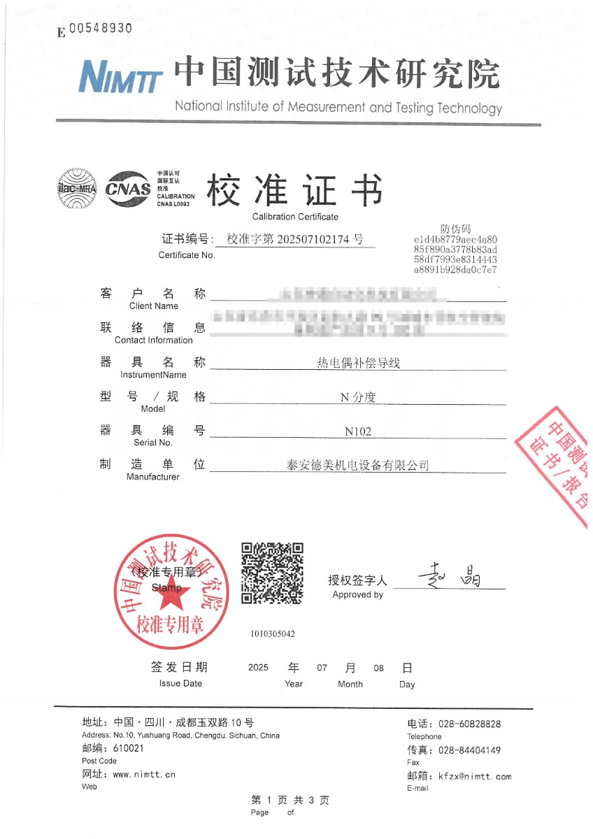 熱電偶補償導線(xiàn)(N分度)校準證書(shū)