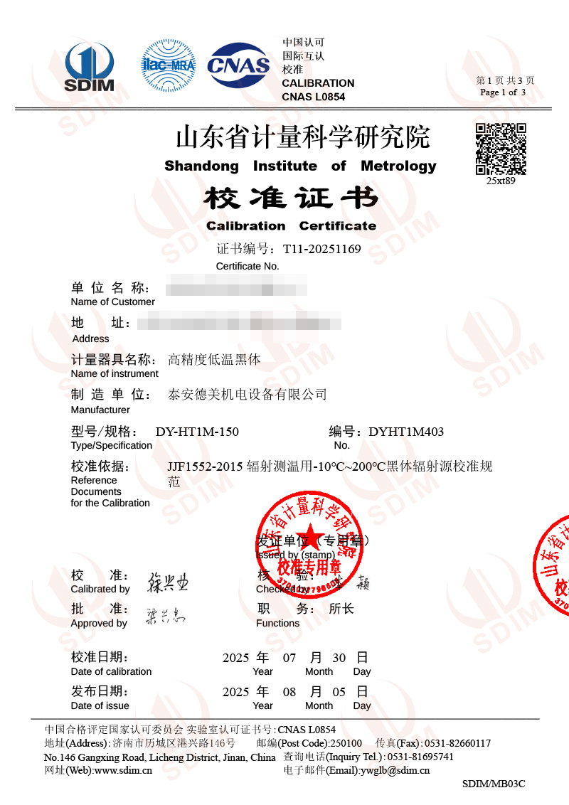 高精度低溫黑體(-10-100℃)校準證書(shū) 2025-8-6 本文被閱讀 3330 次
