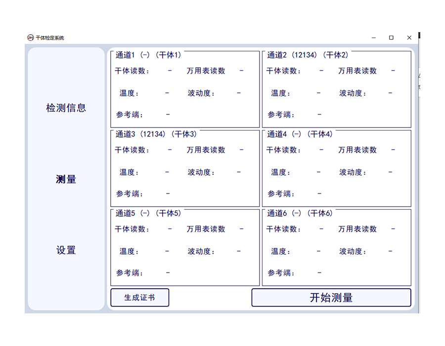 測量狀態(tài)可進(jìn)行多通道狀態(tài)干體爐,萬(wàn)用表讀數。當前標準器溫度,溫度波動(dòng)性等數據的讀取,并一鍵生成證書(shū)??蓪?shí)現一鍵中英文切換。
