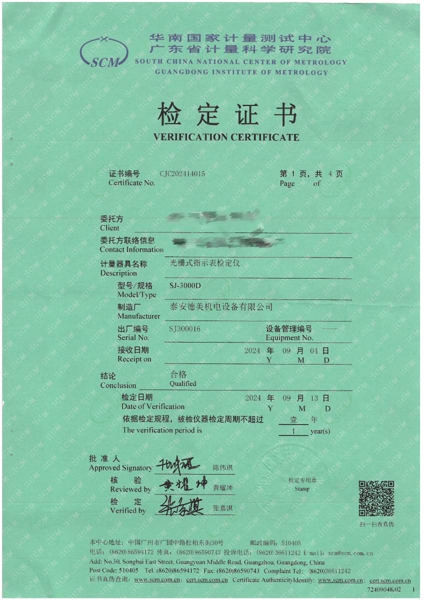 光柵式指示表檢定儀檢定證書(shū) 2024-9-20 本文被閱讀 6698 次