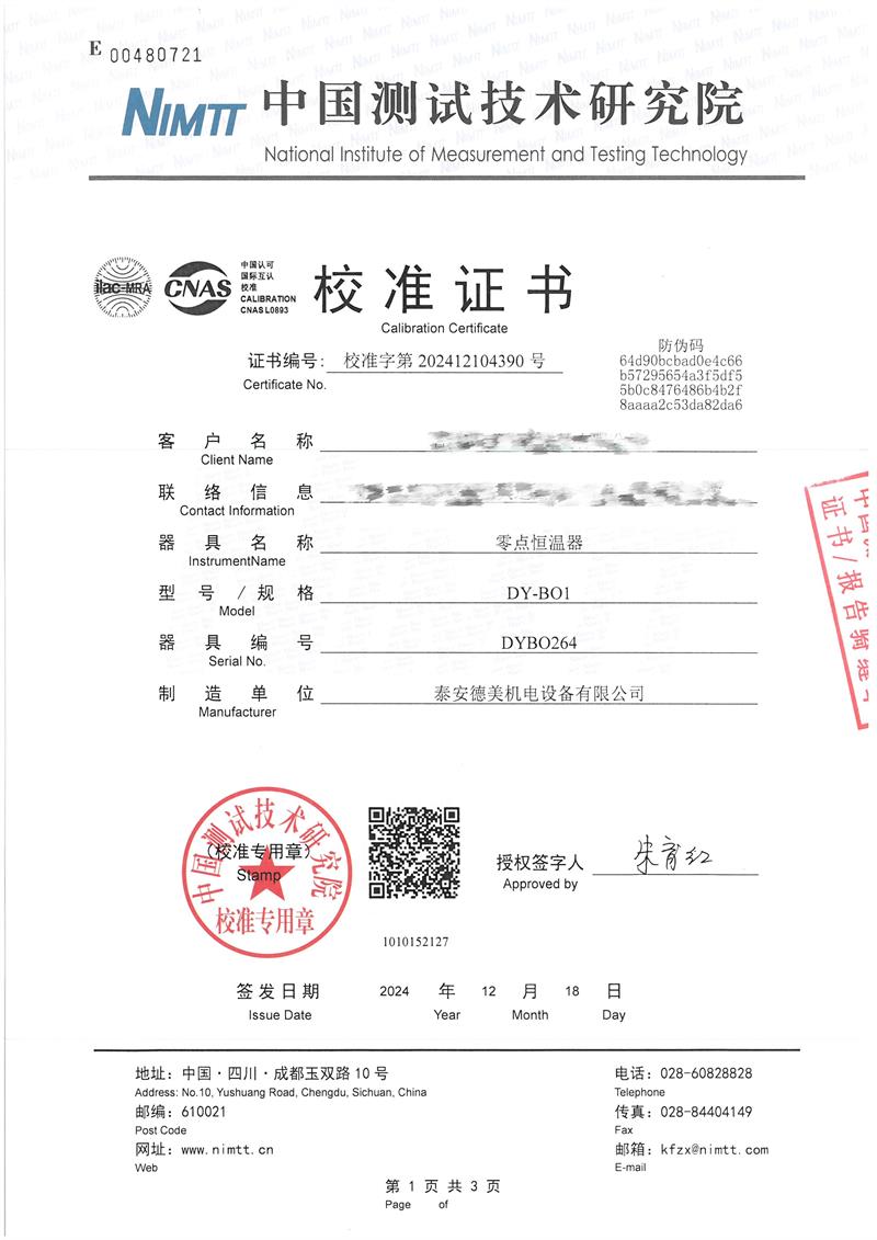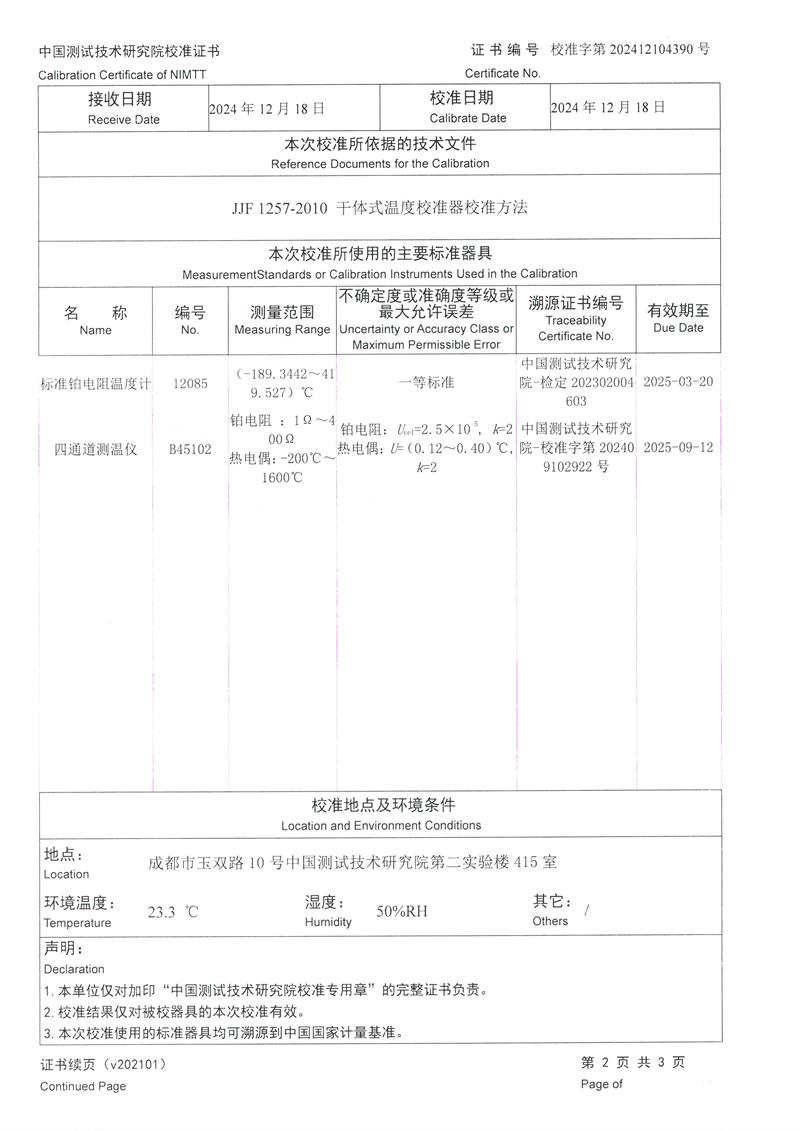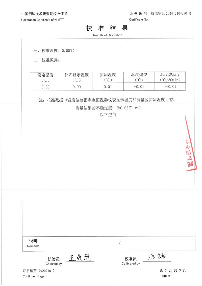 | 上一條:低溫浴式面源黑體爐(-50-80℃)校準證書(shū) | 下一條:高精度制冷恒溫槽(-80~100℃)校準證書(shū) |