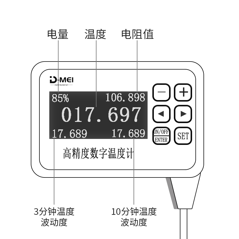 功能 | 實(shí)時(shí)顯示當前溫度、電量顯示、電阻值、溫度波動(dòng) 度、10分鐘溫度波動(dòng)度自動(dòng)跟蹤計算、測試功能 | |