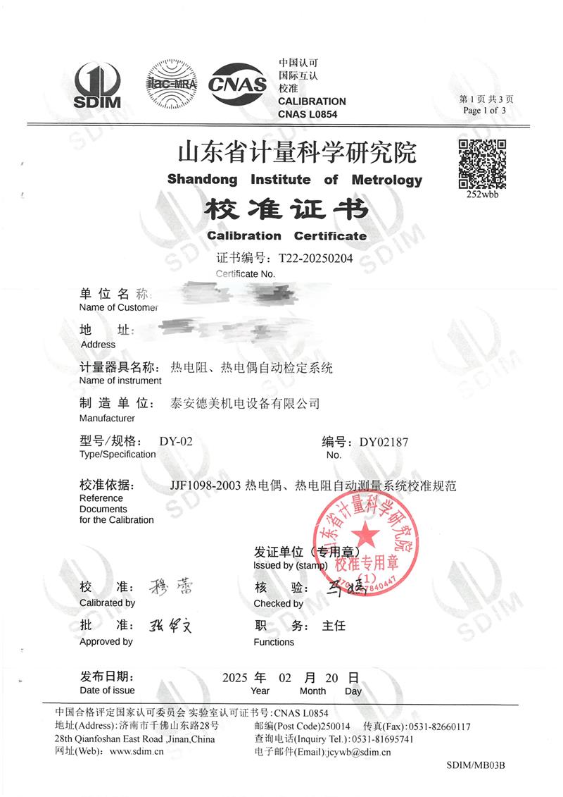 熱電阻、熱電偶自動(dòng)檢定系統校準證書(shū)