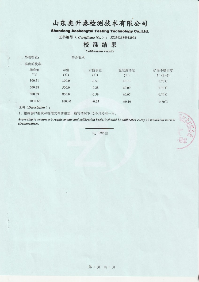 | 上一條:甘肅東興嘉宇新材料有限公司 干體溫度校驗爐 校準證書(shū)(1) | 下一條:高精度制冷恒溫槽(-80~100℃)校準證書(shū) |