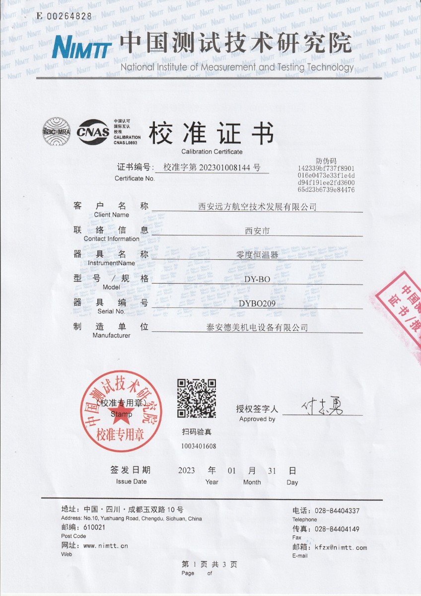 西安遠方航空技術(shù)發(fā)展有限公司 零度恒溫器 校準證書(shū) 2023-4-10 本文被閱讀 14772 次