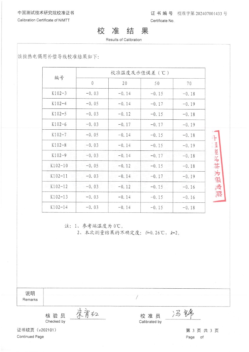 熱電偶用補償導線(xiàn)K分度校準證書(shū)