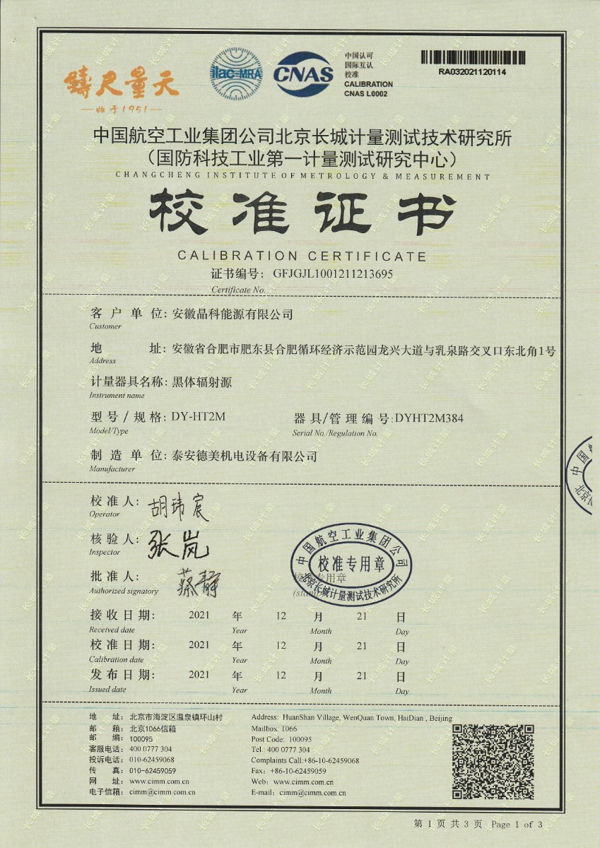 安徽晶科能源有限公司-黑體輻射源 2022-1-4 本文被閱讀 15480 次